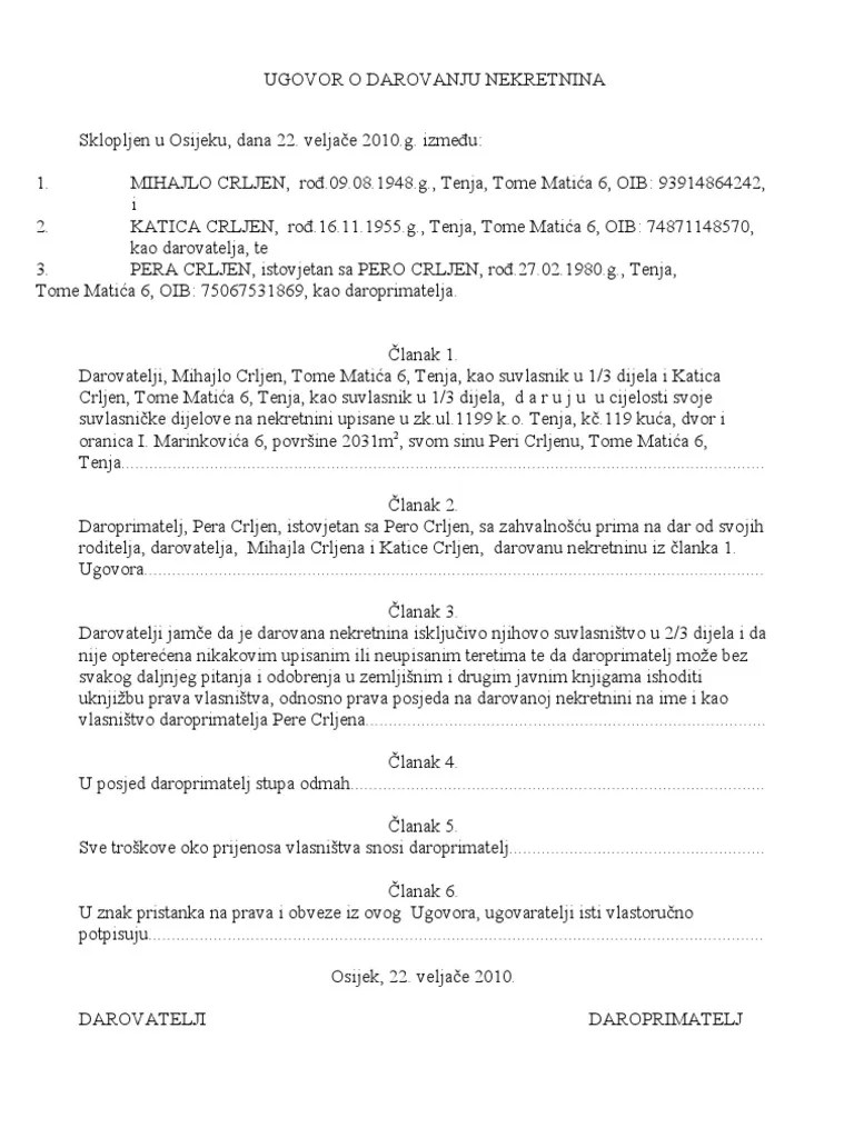 Ovaj ugovor sklopljen je u 6 (šest) istovjetnih primjeraka, od kojih svaka ugovorna strana zadržava po 3 (tri) primjerka. Fizi~ka osoba darovatelj nekretnine 1 otu|enjem se smatra prodaja, darovanje, zamjena i svaki drugi prijenos vlasni{tva. Ovog ugovora njegovo isključivo vlasništvo. 01.02.2012 · darovatelj daruje nekretninu tj. 3 pri utvr|ivanju dohotka danom nabave nekretnine smatra se dan nabave darovatelja... Ovog ugovora njegovo isključivo vlasništvo.