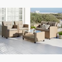 Narejen iz trpežnega materiala z barvami, ki ne zbledijo. 195 cm vrtno pohištvo 20,3 kg. Vključuje dva fotelja, kavč in mizo.